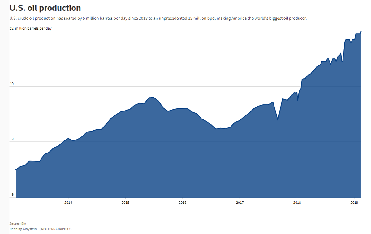С начала 2018 года добыча выросла почти на 2,5 млн. баррелей в день и на целых 5 млн. баррелей с 2013 года.