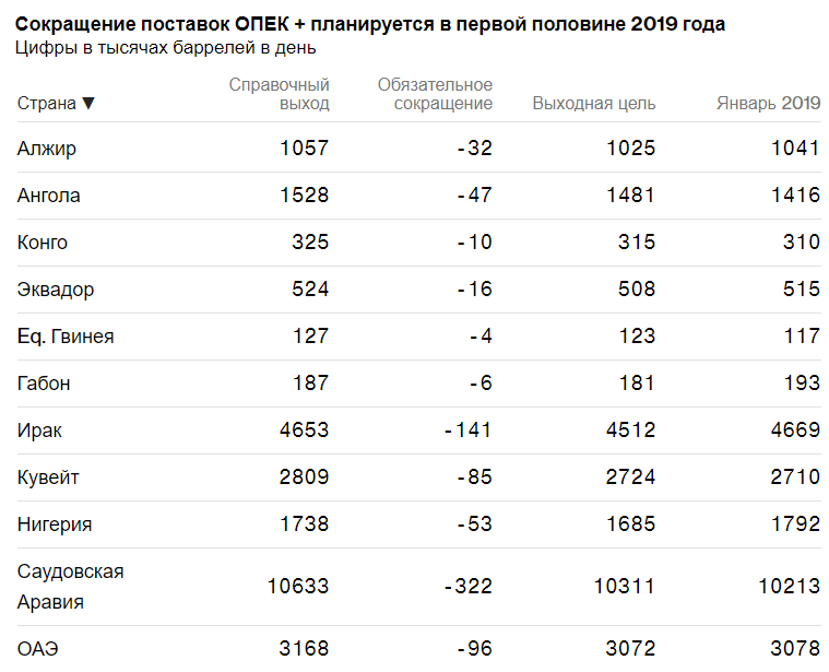 Соблюдение странами ОПЕК+ сделки по сокращению и планы на 2019 год.