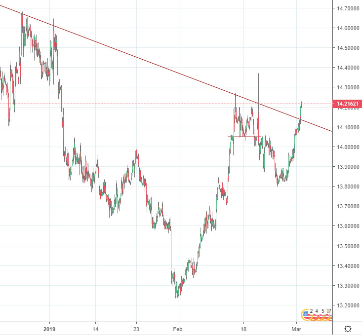 Обе валютные сделки были совершены на основе анализа южноафриканского ранда. Я давно слежу за этой экзотической валютой, которая часто бывает предвестником движения курса рубля к доллару. И в пятницу ранд все-таки пробил и закрепился выше своего нисходящего канала: