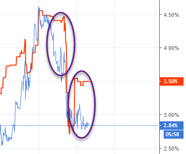 Как небольшое подтверждение можно привести более надежный показатель - доходность 10-летних облигаций США. Она показала очевидную динамику (синее - трежеря, красное - фьюч на СиПи):