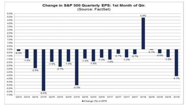 «Неделю назад, глядя на драматичный обвал консенсусных оценок EPS в 1-м кв., мы заметили, что «вечеринка прибыли» позади и дни почти рекордного роста доходов вот-вот с треском закончатся в результате недавнего потока предупреждений о снижении прибыли и негативных предварительных извещений, начиная с Apple, месяц назад впервые с 2001 г. опубликовавшей шокирующее сокращение ориентиров. Как следствие, аналитики снизили свои прогнозы доходов S&P500 в 1-м кв., и оценка EPS в 1-м кв. по методу «снизу вверх» сократилась на 4.1% (с $40.21 до $38.55).