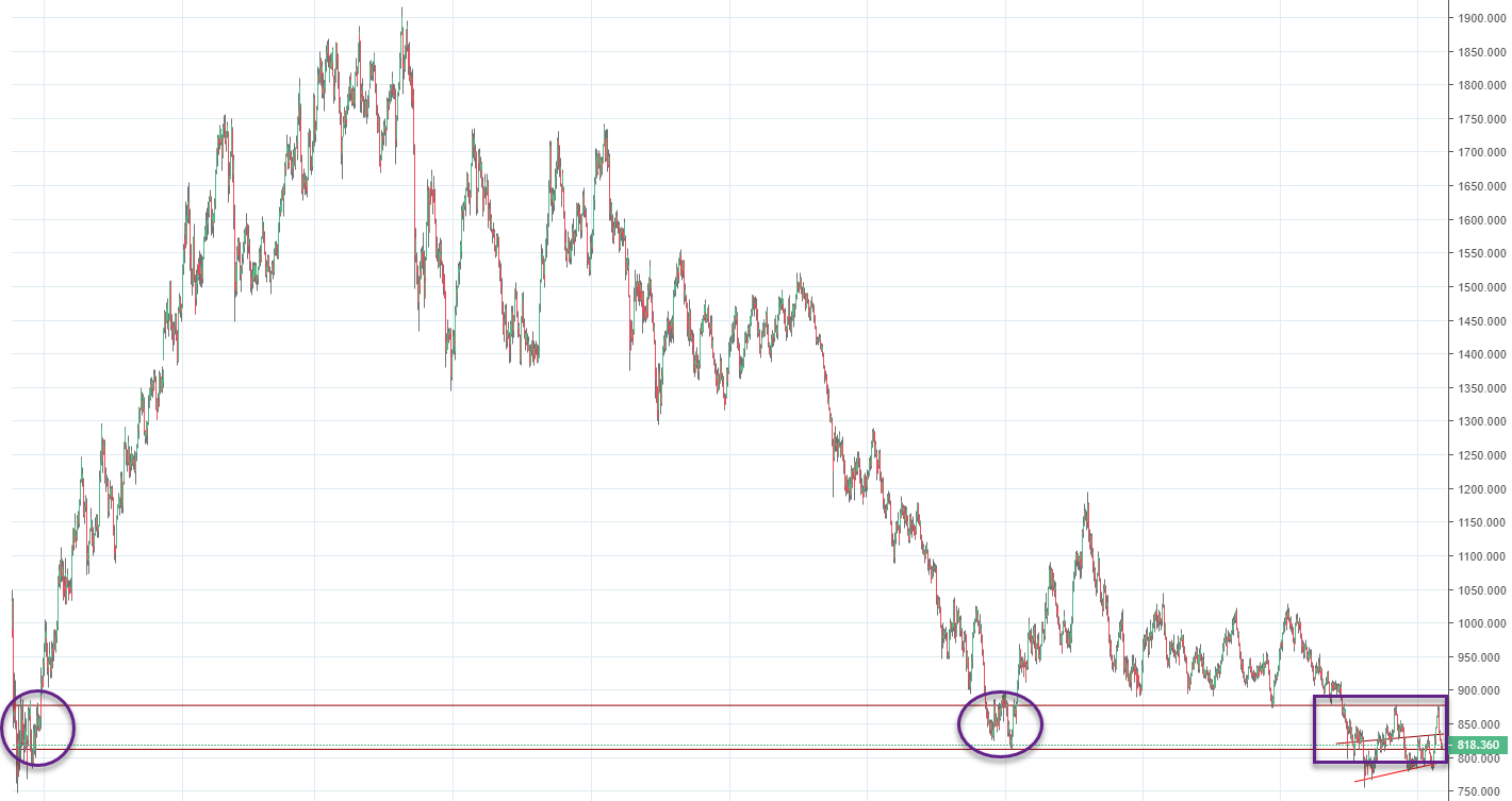 Поддержка около 812 долларов очень важна, эти уровни выступали в качестве поддержки в 2008 и 2016 годах. А сам интервал 800-900 долларов за унцию был минимальным торговым в эти периоды: