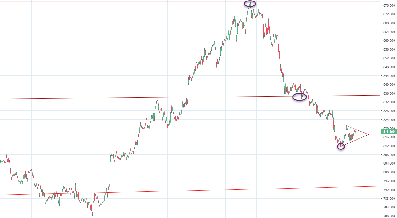 В конце прошлой недели платина, как и другое сырье, была под давлением. Четко отбилась вниз от 877 долларов, не сумела найти поддержку в районе 835 долларов и двинула ниже к 812 долларом, где пока отбивается и консолидируется - формируя треугольник (все цены по тикету XPTUSD на tradingview):
