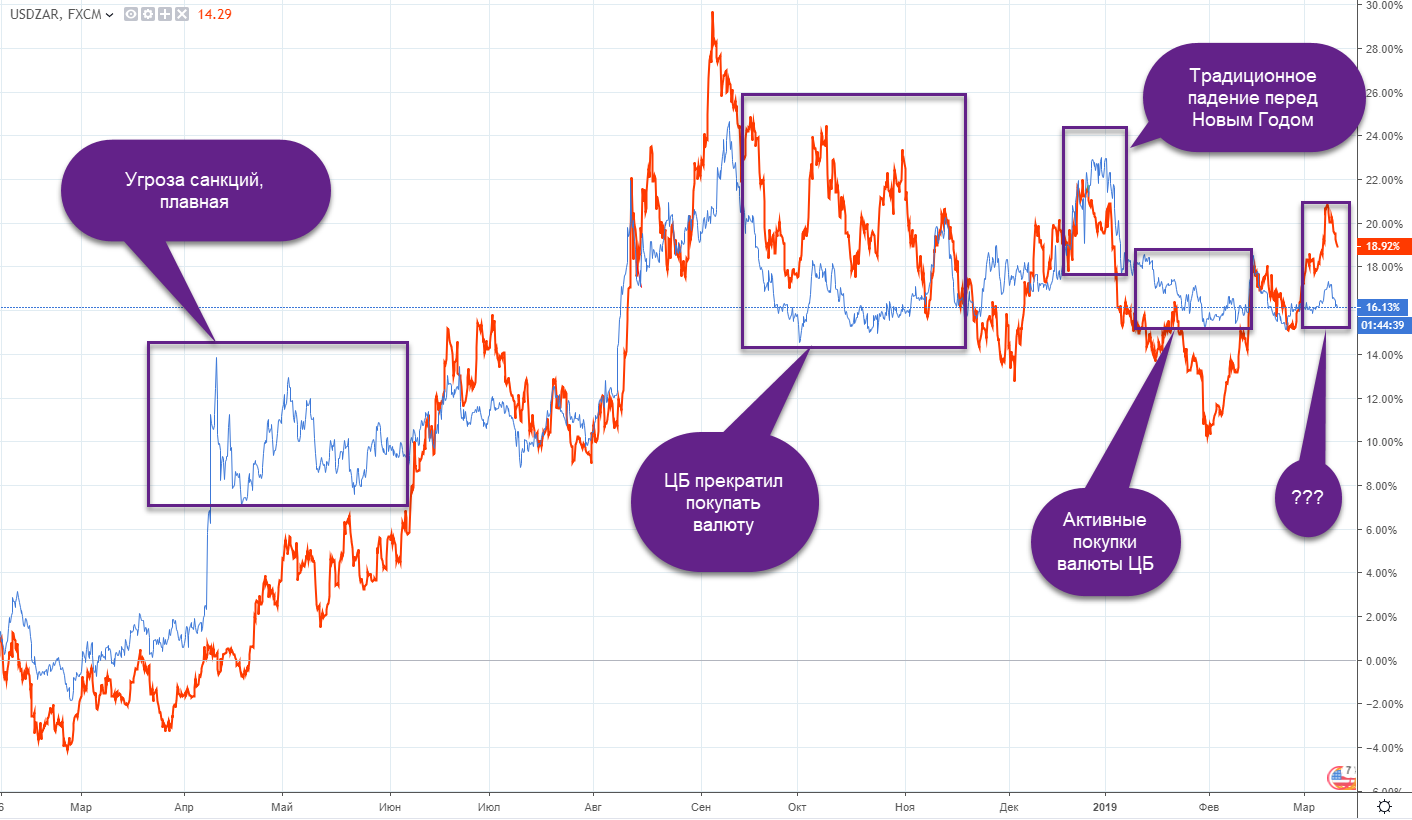 Хотя рубль все еще очень сильно переоценен к другим развивающимся валютам (на примере ранда, где рубль - синий чарт, ранд - красный чарт):
