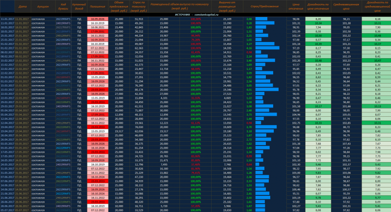 - данные аукционов по размещению ОФЗ, Минфином РФ с начала 2017 г.,