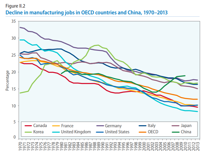 А это следствие автоматизации и роботизации производств. Процент людей занятых в производственной деятельности по странам OECD и Китай:
