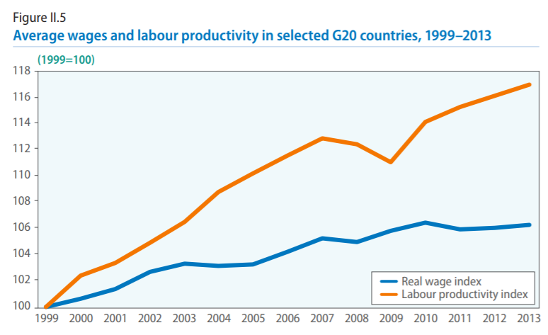 При этом всё больше растёт разрыв между ростом производительности труда и ростом вознаграждения за труд рабочим: