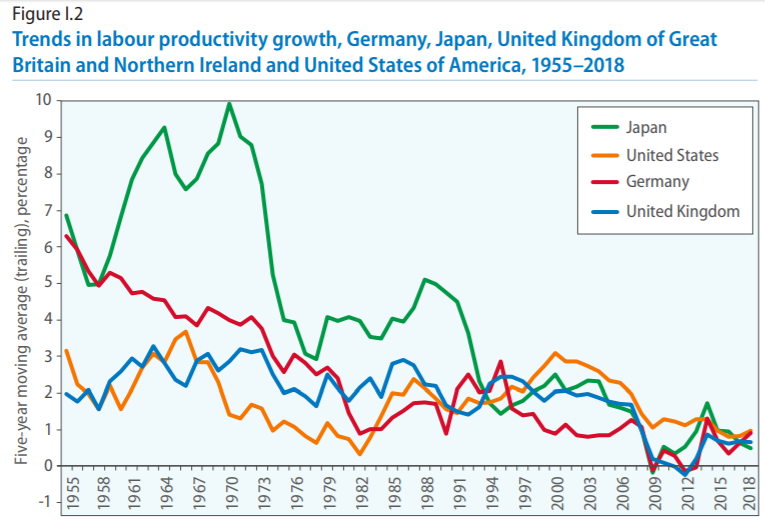 На первой картинке представлена пятилетняя средняя роста производительности труда. На мой взгляд этот график явный признак кризиса текущего научно-технологического уклада: