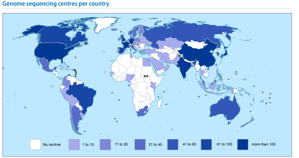 Считается, что следующий научно-технологический уклад может быть связан с биотехнологиями. Так что, просто интересная картинка по количеству центров по расшифровки генома в каждой из стран. Россия занимает не плохое место в мире по этому показателю: