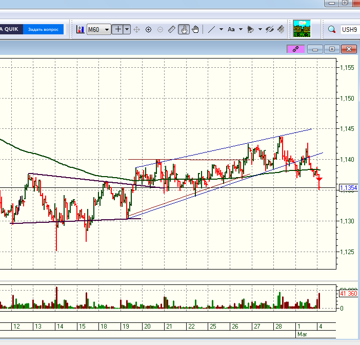 Уже к вечеру решил открыть шорт по USH9 - из-за новостного фона (аналитики рекомендуют покупать американские компании), из-за достижения максимумов некоторыми бумагами, в частности MSFT (AAPL на мой взгляд тоже достиг одно из сопротивлений), из-за обновления мартовских максимумов, но прокол вяленький.