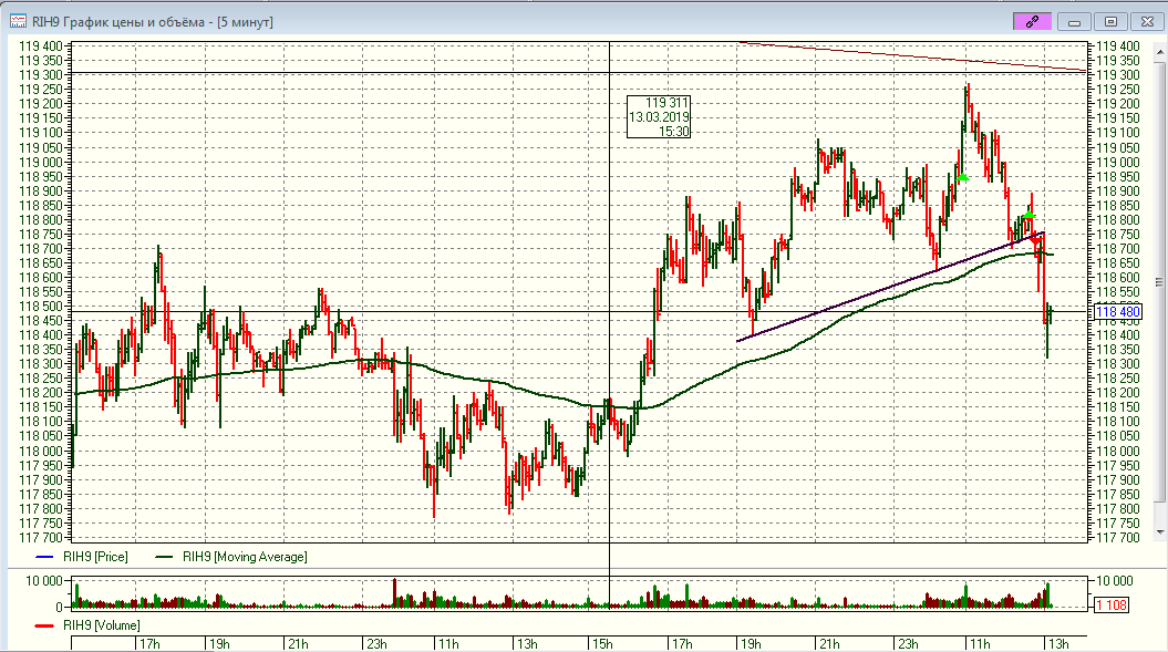 В ожиданиях Si пониже - закрыл Ri - чего ждать выноса? - можно же повыше, в итоге вышел пораньше, зону моего стопа попробовали и вниз. Ех, а ожидал 119400 перезайти, ну что поделать, пришлось восстанавливаться пониже. (причем я уверен, стоял бы мой стоп 119600 - попробовали бы 119600). Восстанавливался 2 раза - на ноуте и маленьких таймфреймах не удобно - общей картинки не видно).