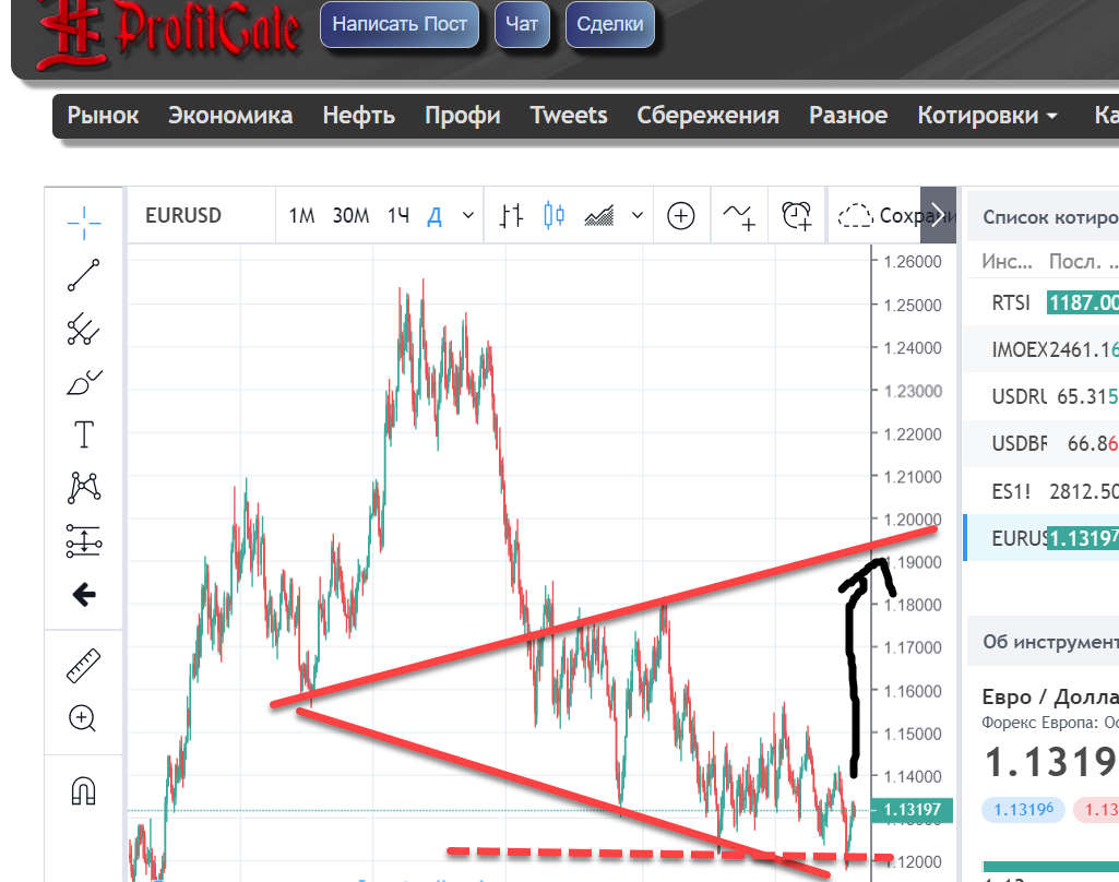 Отдельный интерес тут представляет то, что рубль технически может слабеть на слабеющем долларе к евре. Возможно это говорит нам о падении в нефти.