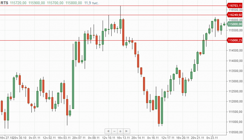 Фьючерс на индекс РТС на торгах в четверг пробовал на прочность уровень 116000п., где сопротивлениями выступают отметки 116250п-116700п. Локальная поддержка на данный момент расположена на 115000п.