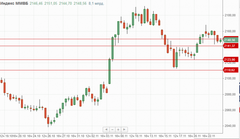 Индекс ММВБ на прошедшей торговой сессии снизился на 0.54% закрывшись под отметкой 2150п., что формально дает повод для продолжения снижения в район 2141п.-2124п. Тем не менее повторный возврат индикатора выше 2150п. даст неплохие шансы на продолжение роста.