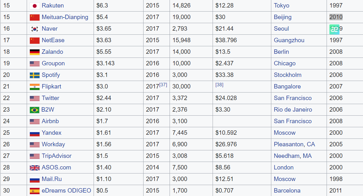 Данные по капитализации компаний постоянно меняются, так что в настоящий момент места в топе распределены по другому. Но компании в основном всё те же. И главное на что можно обратить внимание, это что в последнее десятилетие из тридцатки мирового топа были созданы лишь китайская Meituan-Dianping и испанская eDreams ODIGEO, что составляет менее 10% от общего количества.