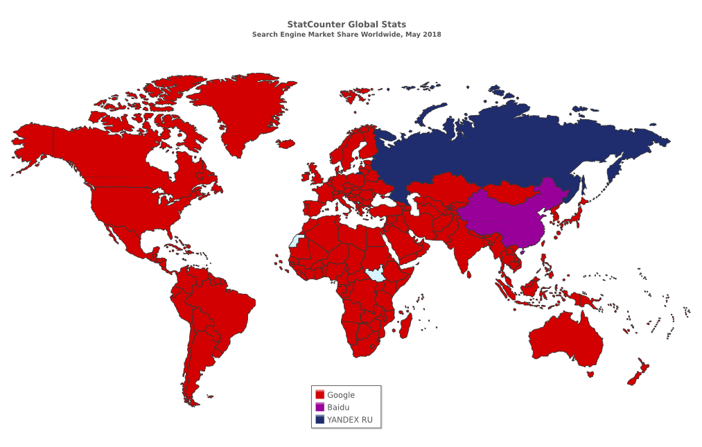 Как видим из этой карты есть только две страны в мире которые не подмял под себя Alphabet Inc. и его Google. И если в Китае эта ситуация была создана искусственно ограничительными мерами государства по отношению к американскому поисковику, то в России национальная поисковая система Яндекс выстояла в честной конкуренции.