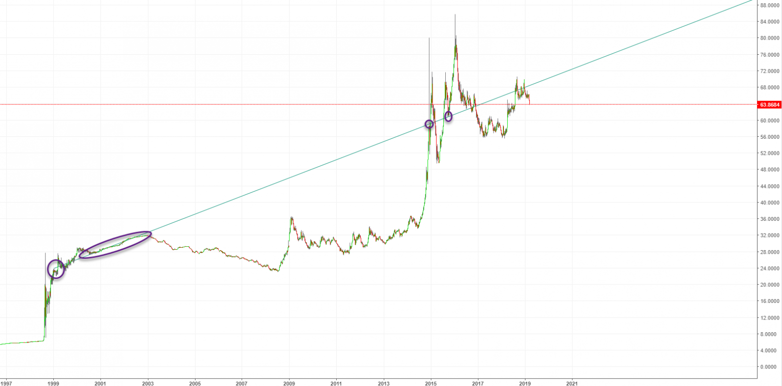 Начало тренда я беру от момента стабилизации курса после дефолта 1998 года. Наверное, это и есть начало относительно свободного формирования стоимости валютной пары.