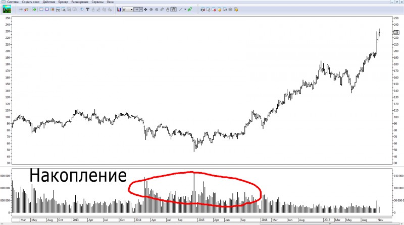 Переходим на недельный тайм фрейм. На нем видно, что с марта 2014 года по сентябрь 2015 года был повышенный объем торгов. В те года мы еще не могли знать, что же такое происходит? Кто-то закупает акции, или кто-то продает?Но явно на рынке была суета. Кто-то может возразить, что объем торгов ничего не значит. Я позволю себе не согласиться с этим.