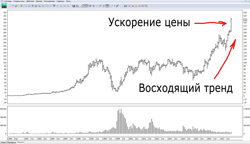 Начнем наш анализ с месячного тайм-фрейма. На данном тайм-фрейме очень отчетливо виден восходящий тренд. Надеюсь, в этом никто не сомневается? Также пока не было глубоких коррекций и повышенных объемов торгов. Это говорит мне о том, что тренд пока достаточно сильный. Единственное, что не очень нравится, это, так называемое, ускорение цены в ноябре месяце. Как правило, в такие моменты и происходят продажи акций крупными игроками.