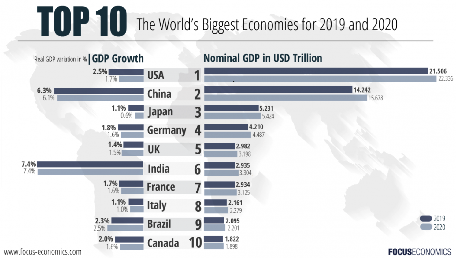 Тем не менее, исходя из номинального ВВП, измеряемого только в долларах США, США сохраняют свое место, за которым следуют Китай и Япония. В этом посте мы рассмотрим ведущие экономики мира в соответствии с консенсус-прогнозами по номинальному ВВП на 2019 и 2020 годы.