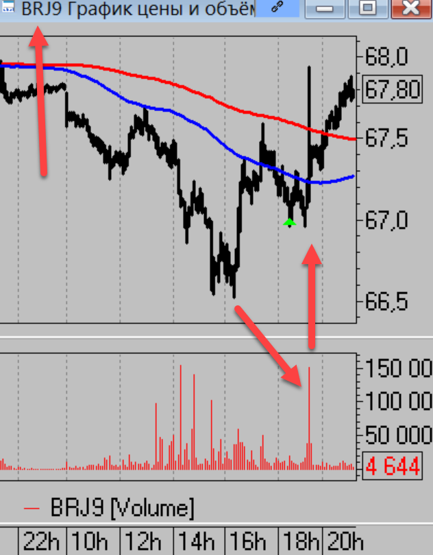 По новому нефтяному контракту был большой вход на рынок с 13.25 до 14.50 тремя траншами все на шорт — первый 45000 на 66.93, второй 75000 на 66.59 и третий 45000 на отскоке 66.63.