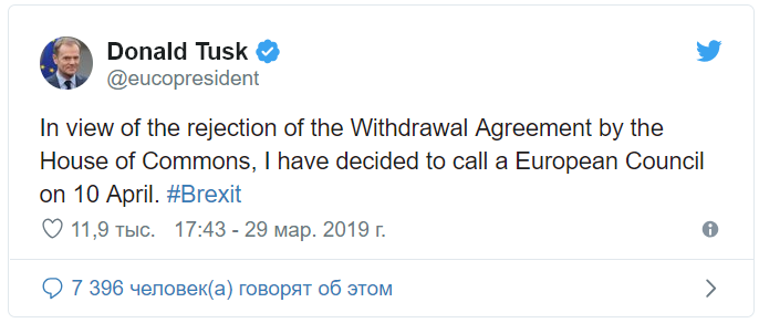 Великобритания не достигла соглашения на этой неделе. Следовательно, отсрочка Brexit до 22 мая ей не предоставляется. Страна должна покинуть ЕС 12 апреля. Официальный ответ Еврокомиссии также подразумевал риск выхода Великобритании без сделки.