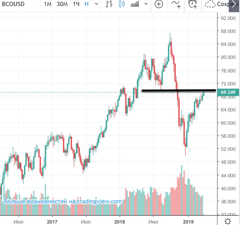 При этом технически нефть уже практически вышла на мощное сопротивление в виде локальных лоёв прошлого года: