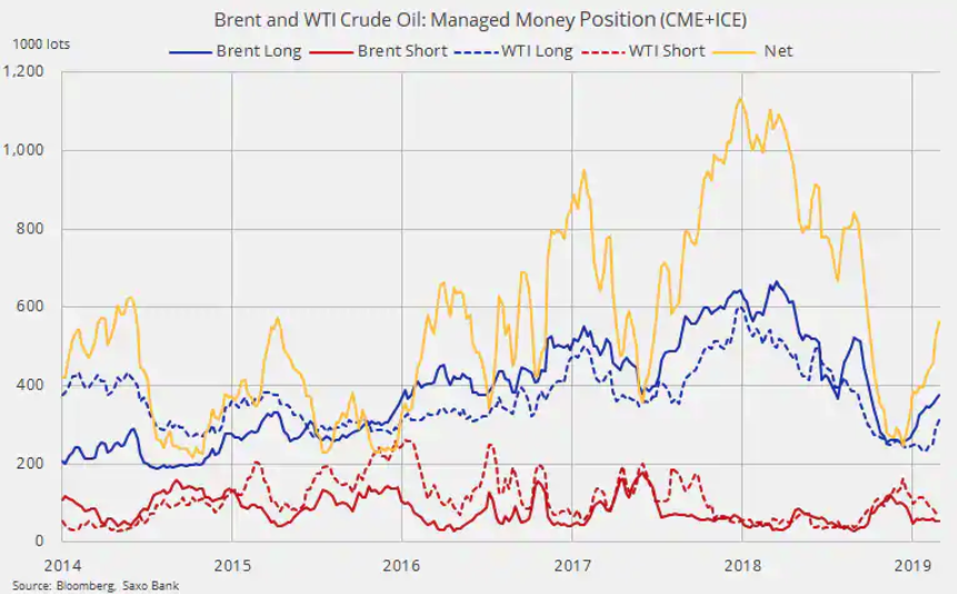 Комбинированная нефть марки WTI и Brent подскочила на 39 тыс. Лотов до 560 тыс., что является 22-недельным максимумом. С момента достижения 8 января более чем трехлетнего минимума на уровне 240 тыс., Шорты были вытеснены с рынка, оставив соотношение длинная / короткая позиции на 6,8, самое высокое с октября прошлого года, когда Brent торговался выше $ 80.