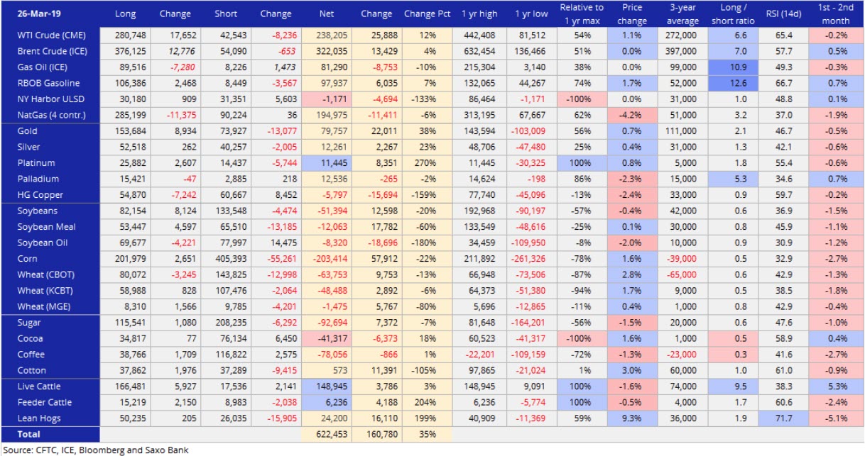 За последние три недели покупок спекулянты удвоили свои длинные позиции по 25 основным товарным фьючерсам. Текущие данные COT это данные по 26 марта, т.е. они ещё не учитывают сегодняшний китайский оптимизм и в показывают динамику сложившуюся после голубиных заявлений ФРС на последнем заседании.
