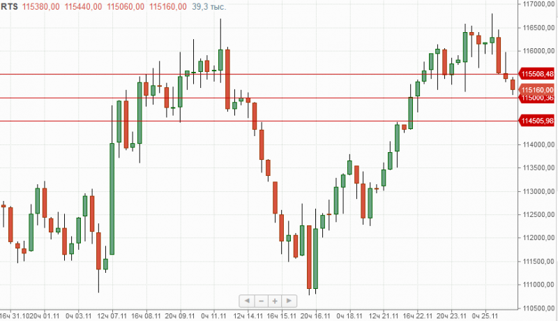 По итогам прошедшей торговой сессии фьючерс на индекс РТС закрылся под отметкой 115500п., что дает повод инструменту продолжить снижение с целями 114500п.-113500п., где локальными поддержками выступают 115000п и 114000п. Сопротивления в текущей ситуации расположены на отметках 115500п. и 115950п.