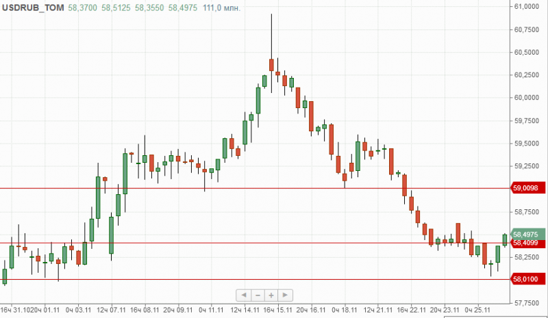 Рубль на торгах в понедельник закрылся на отметке 58,49 и на данный момент будет определятся с направлением движения. Локальным сопротивлением в текущей ситуации выступает отметка 59, поддержкой служит 58,40.