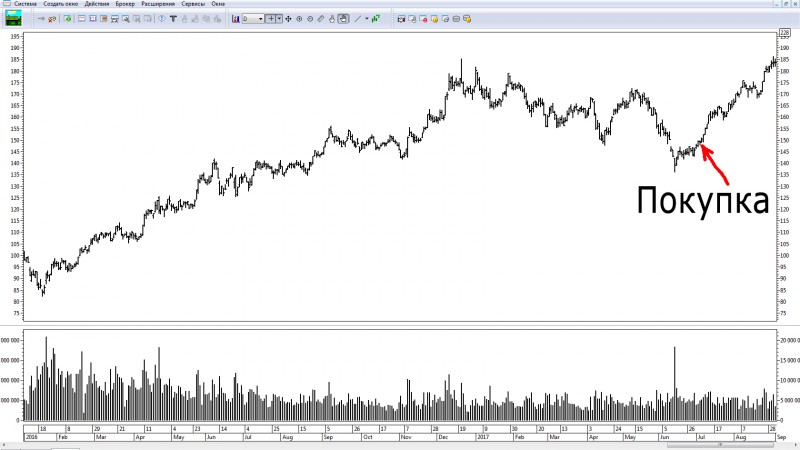 Перед тем как я зашел в покупки, я очень долго следил за данной бумагой. Я не входил в сделку, потому что не видел для себя точки входа. Я ждал. У меня за год набирается очень небольшое количество сделок. Бывает, что два-три месяца я не могу найти свою сделку. Но меня это совершенно не пугает. Я знаю, что наступит время, и она появится.