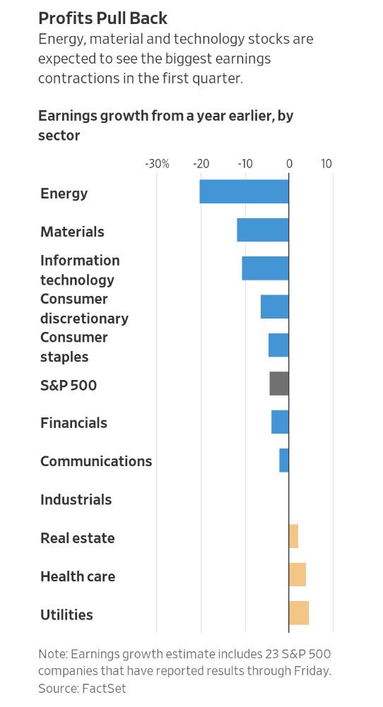 Доходы компаний в первом квартале, согласно прогнозам, сократятся на 4,2% по сравнению с аналогичным периодом прошлого года, это первое снижение со второго квартала 2016 года, при этом ожидается, что энергопотребление будет самым большим, около 20%, а информационные технологии - на 10%.