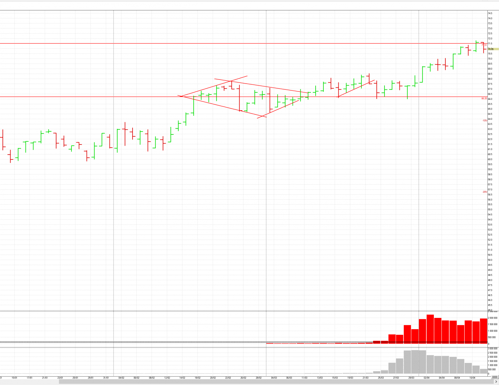 Итак, многие задаются вопросом, что случилось? Почему падает ОИ в нефти? Все очень просто, коллеги. Еще в прошлом фьючерсе в нефти был образован бриллиант. Мало кто знает и понимает, но профессионалы, обычно, расторговывают такую формацию вверх. Профи знает как работает рынок и с минимальным риском покупал там на всю котлету. Как сейчас помню когда цена на старом фьючерсе была 57,1(эквивалентно 65 на нынешнем фьючерсе) я закрыл свой шорт и перевернулся в лонг. Здесь написал об этом пост. Ребята покупайте без риска, в нефти бриллиант. Выходить будем на 70-71. Меня закидали камнями. Мл бриллиант не так рисуется - почитайте книжки по тех анализу. Друзья, трейд закончился. Профессионалы закрывают позы в нефти, что видно по ОИ. Кстати, я тоже закрыл свою позу. Дальше сидеть в нефти рискованно и не предсказуемо. Один хороший трейд состоялся. Теперь нужно время, чтобы в нефти нарисовалось что-нибудь интересное. Сейчас интереснее торговать Российский рынок. В нем намечается что-то интересное.