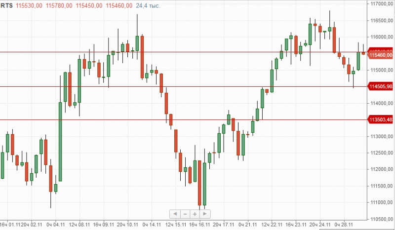 По итогам прошедшей торговой сессии фьючерс на индекс РТС закрылся вблизи отметки 115500п., закрепление над которой даст шансы инструменту на продолжение роста в район 116150п.-116800п. Локальной поддержкой на данный момент выступает 115000п. и основной 114500п., проход которой может усилить снижение к уровню 113500п.