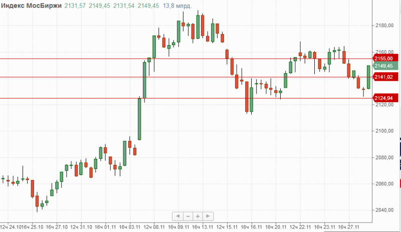 Индекс Мосбиржи во вторник сумел отыграть потери понесенные в первой половине дня и по итогам торгов закрылся ростом на 0,16% вблизи сопротивления 2150п. и теперь для возврата к росту индикатору нужно закрепиться над отметкой 2155п. в противном случае снижение может возобновиться с прежними целями 2141п.-2125п.