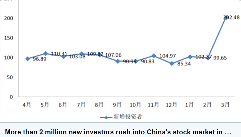 Китайские СМИ сегодня сообщают статистику за март месяц, по ней в марте на китайский фондовый рынок пришло более 2 млн. новых инвесторов.