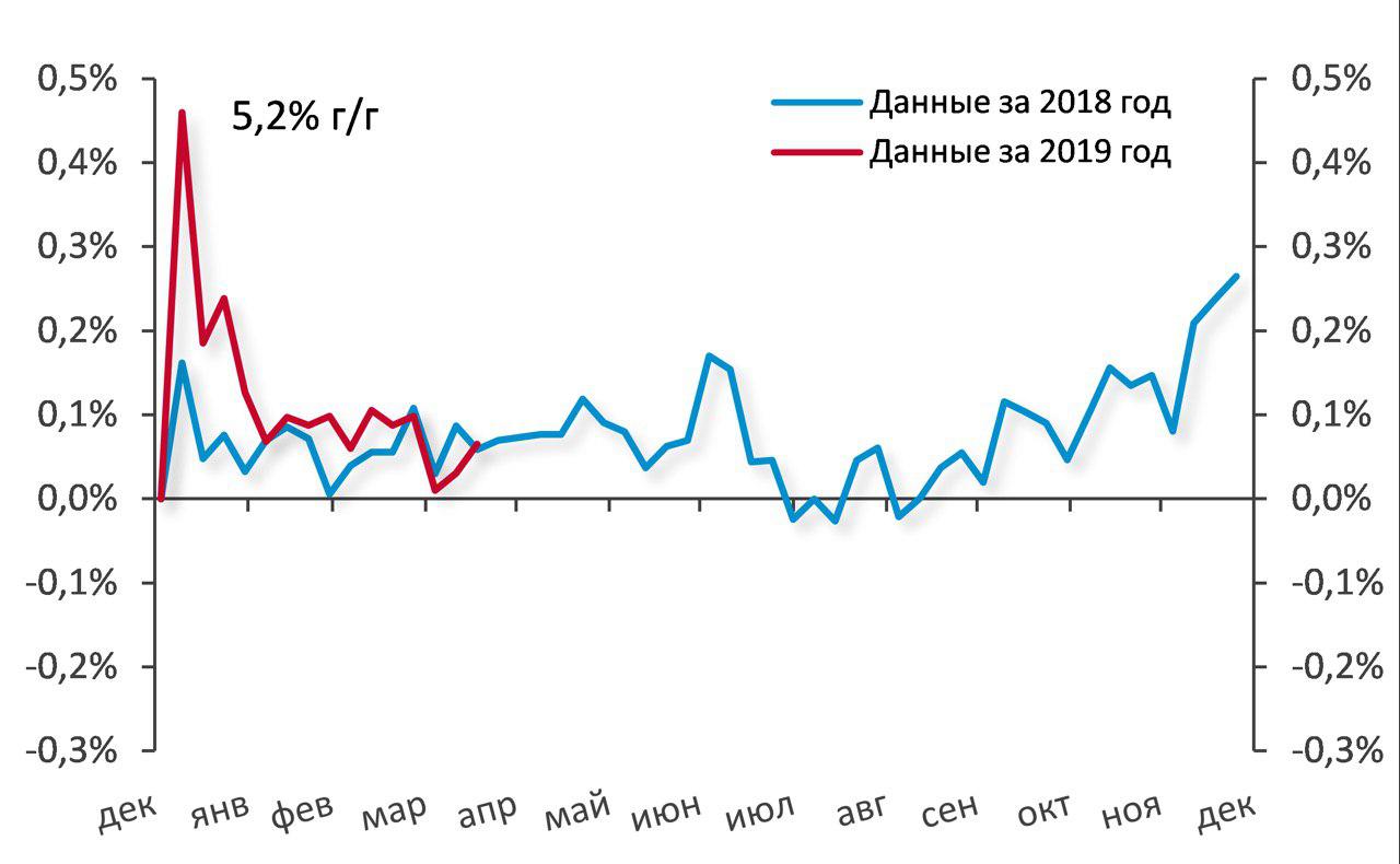 Потребительская инфляция в России за прошедшую неделю немного ускорилась, составив 0,1%. В годовом выражении, по нашим оценкам, показатель сохраняется на уровне 5,2%.
