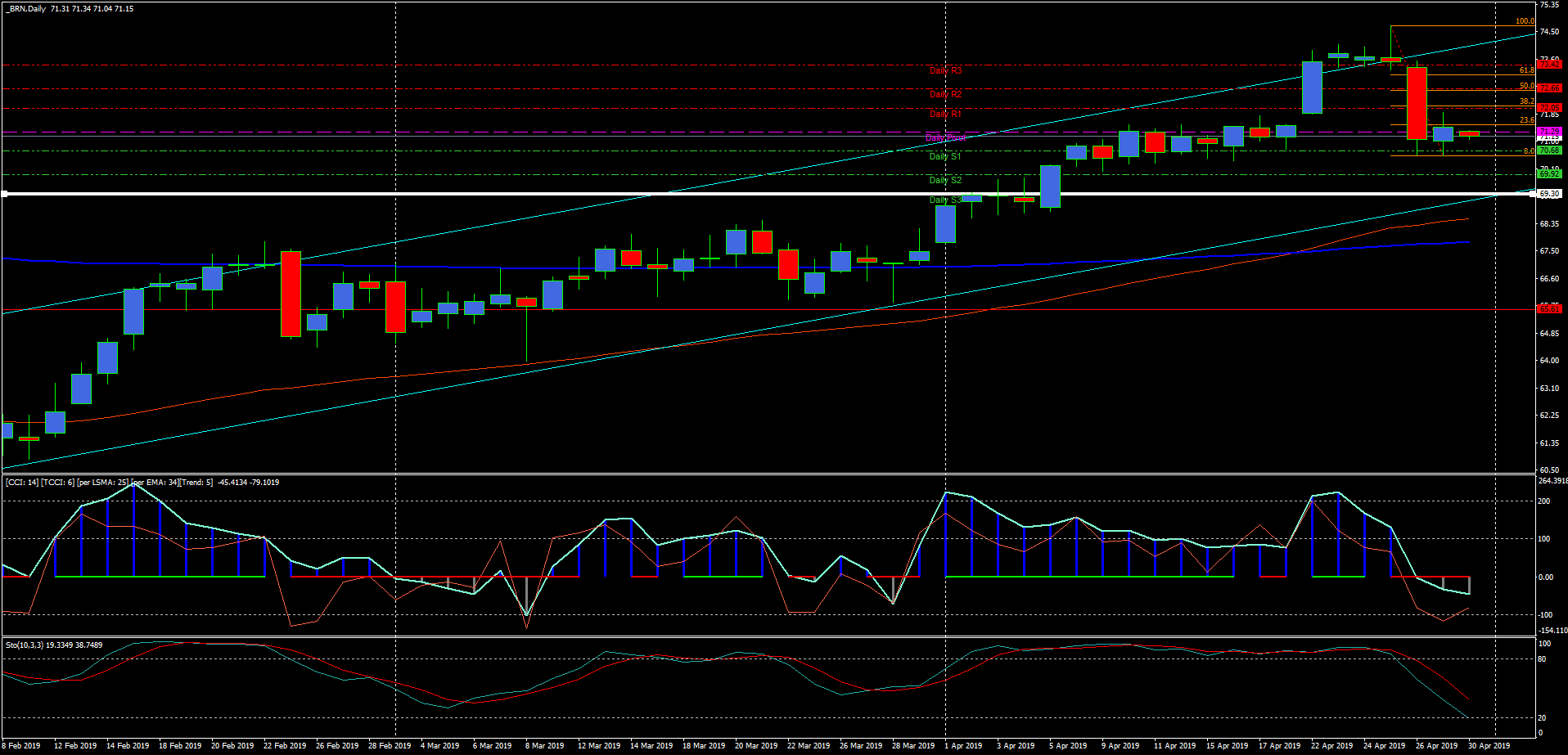 Привожу график дневной, где белой линией показан следующий уровень куда направиться нефть – это цель 69.30