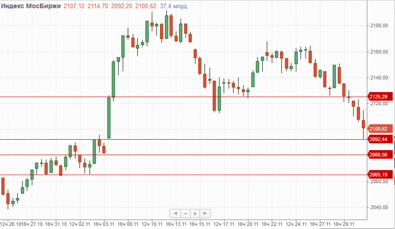 Индекс Мосбиржи на прошедшей торговой сессии продолжил негативную динамику показав минимум на отметке 2092,2п, которая в свою очередь является среднесрочной поддержкой в индикаторе, проход которой откроет дорогу в район 2080п.-2065п. Для возврата к росту индексу нужно закрепляться над 2125п.