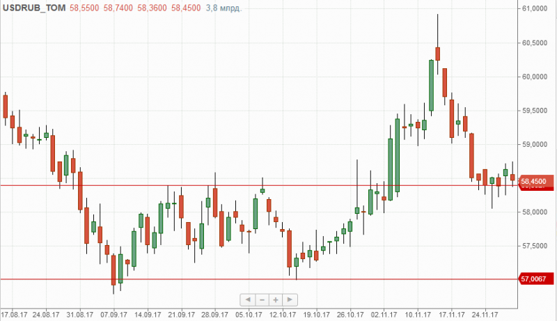 В четверг рубль большую часть торговой сессии провел в узком диапазоне 58,40-58,50 на фоне ослабления доллара к ведущим мировым валютам, так же поддержку курсу национальной валюты оказывали нефтяные котировки, демонстрировавшие положительную динамику на продлении сделки ОПЕК.В текущей ситуации если котировки смогут закрепиться под отметкой 58,40, рубль сможет вернуться в диапазон сентяря-октября 58,40-57.