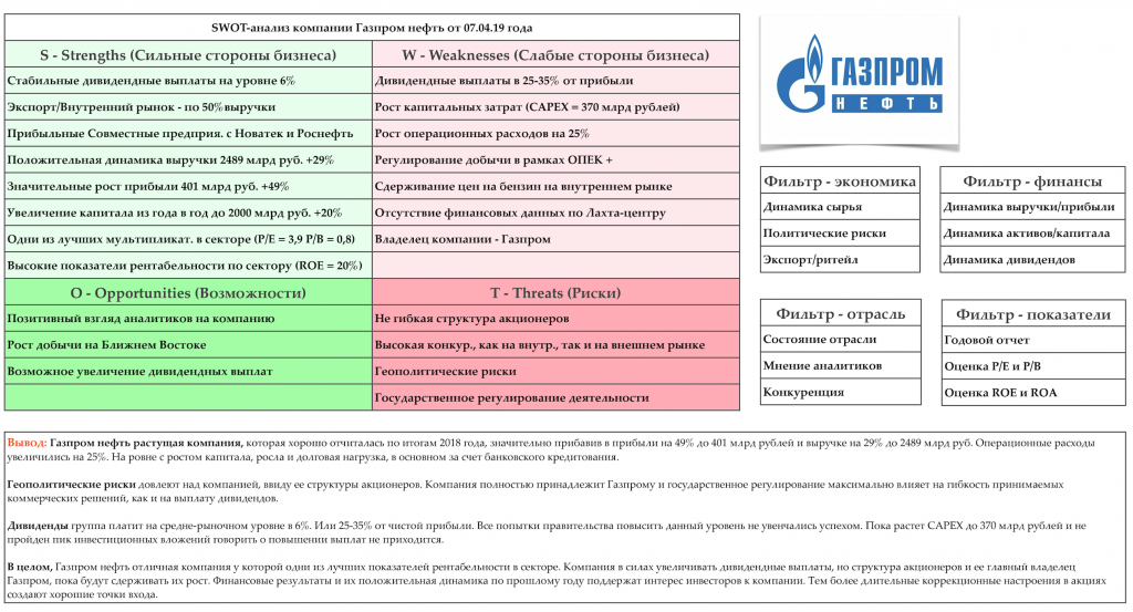Всем привет друзья! На очереди Газпром нефти. Давайте посмотрим на показатели этой компании. Естественно, мысли визуализируем с помощью SWOT-анализа.