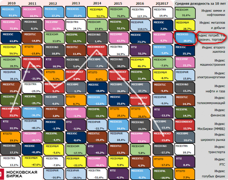 «Индекс акций компаний потребительского сектора» с средней доходностью 28% годовых и он достаточно волатильный, что радует обычного среднесрочного спекулянта.