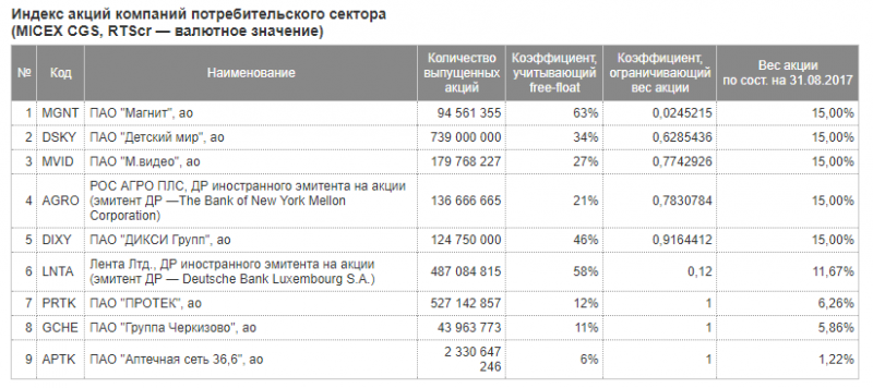 Акции входящие в состав индекса: