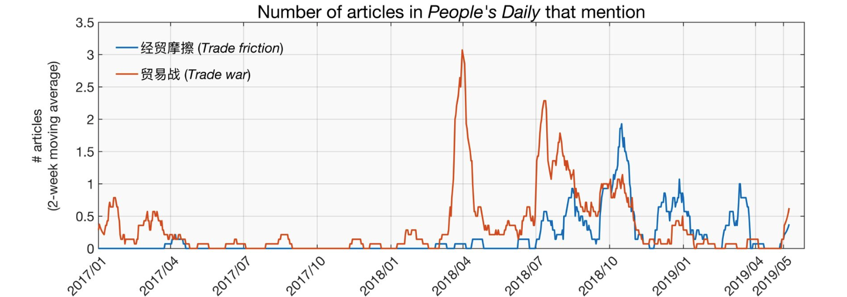 На графике приведены две двухнедельные средние которые показывают, как характеризуются отношения в статьях красная линия - отношения обозначаются как "торговая война". Синяя линия - "торговые разногласия".