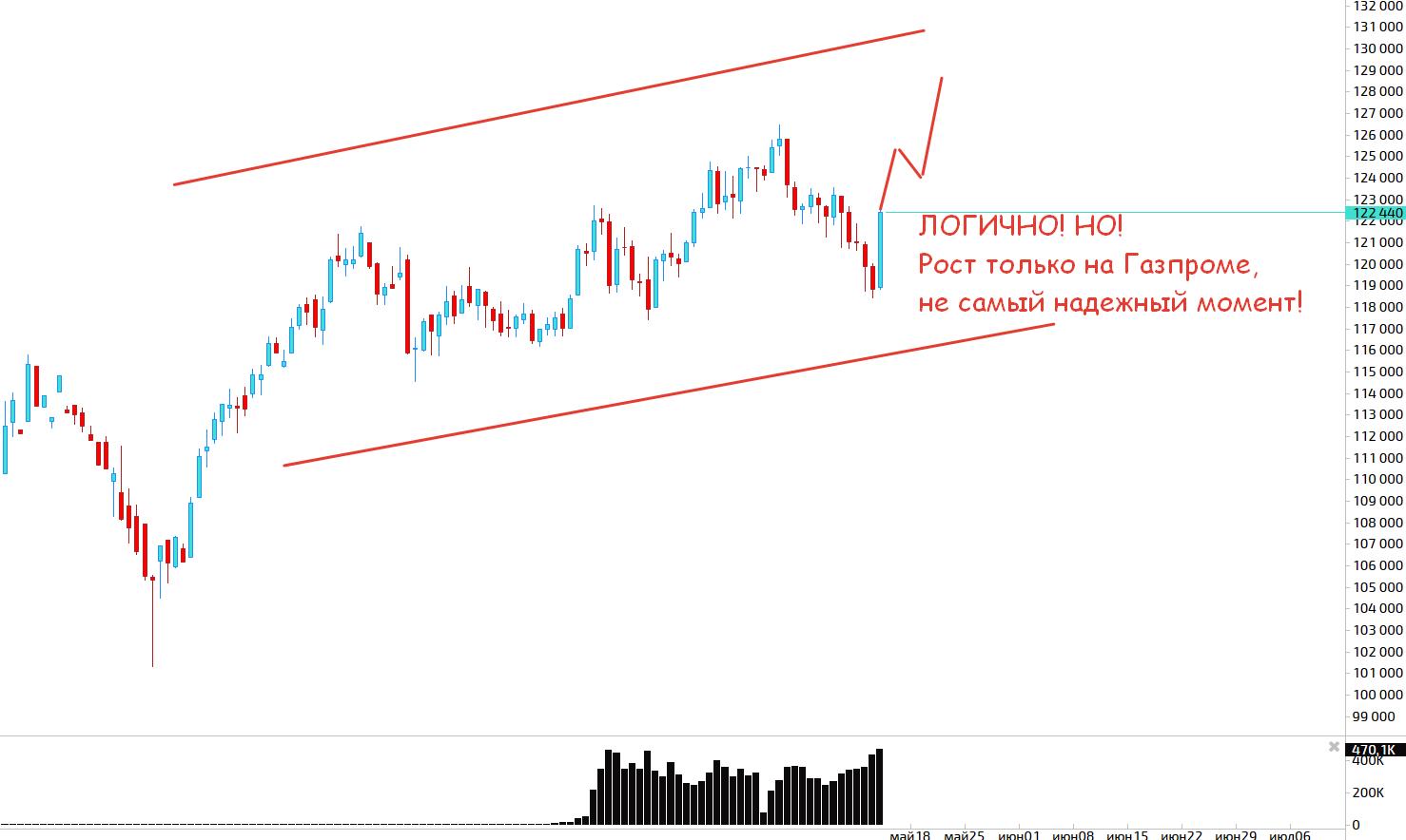 Основные акции не дают позитива, Лукойл пока падает, Сбербанк тоже не склонен к росту, падение Роснефти ослабло, но пока не прекратилось и на чем тут расти индексам? Будем посмотреть, а вот шортить Газпром я полез вчера рано, хотя в целом до сих пор считаю, что шорт после такого роста новостного имеет смысл, но без эйфории, нужно дождаться продаж, вчера был жор, продаж не было!