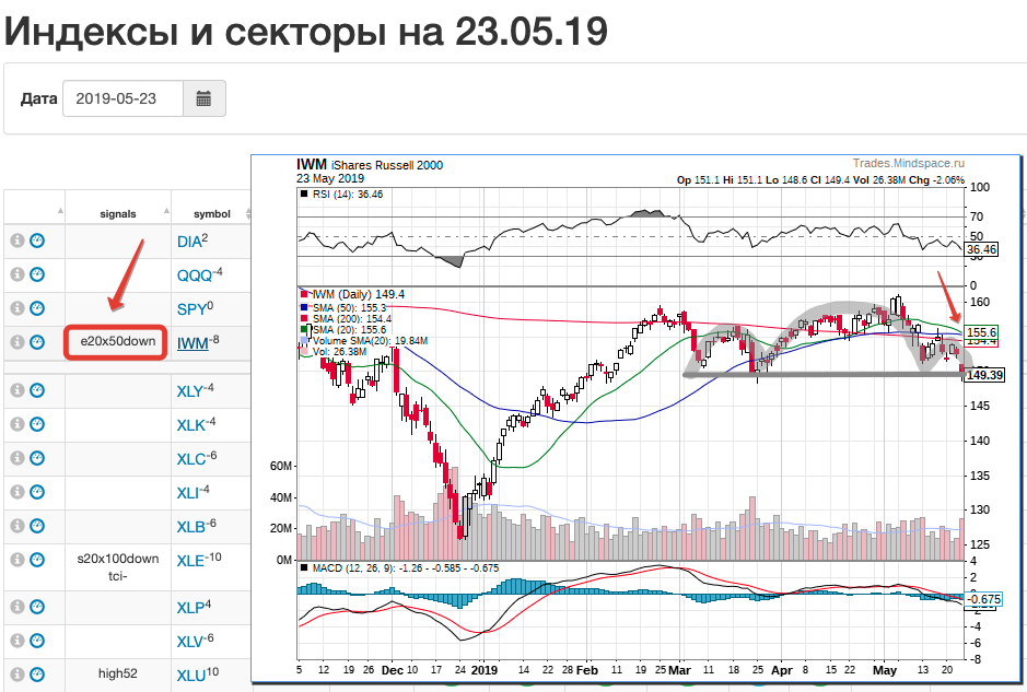 Схожая ситуация (голова и плечи) и в акциях малой и средней капитализации IWM. С тем лишь отличием, что здесь есть сигнал разворота среднесрочной тенденции - ухода ЕМА(20) под ЕМА(50). И это может быть первым звоночком. (Если вы подписаны на Статус, то увидели вчера этот сигнал.) "Малыши" быстрее "крупняка" реагируют на настроение рынка. Поэтому и за их "шеей" важно смотреть.