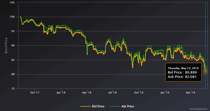 Цена облигаций c погашением в 2025 году ISIN: USU8810LAA18 катится по наклонной с момента выпуска: