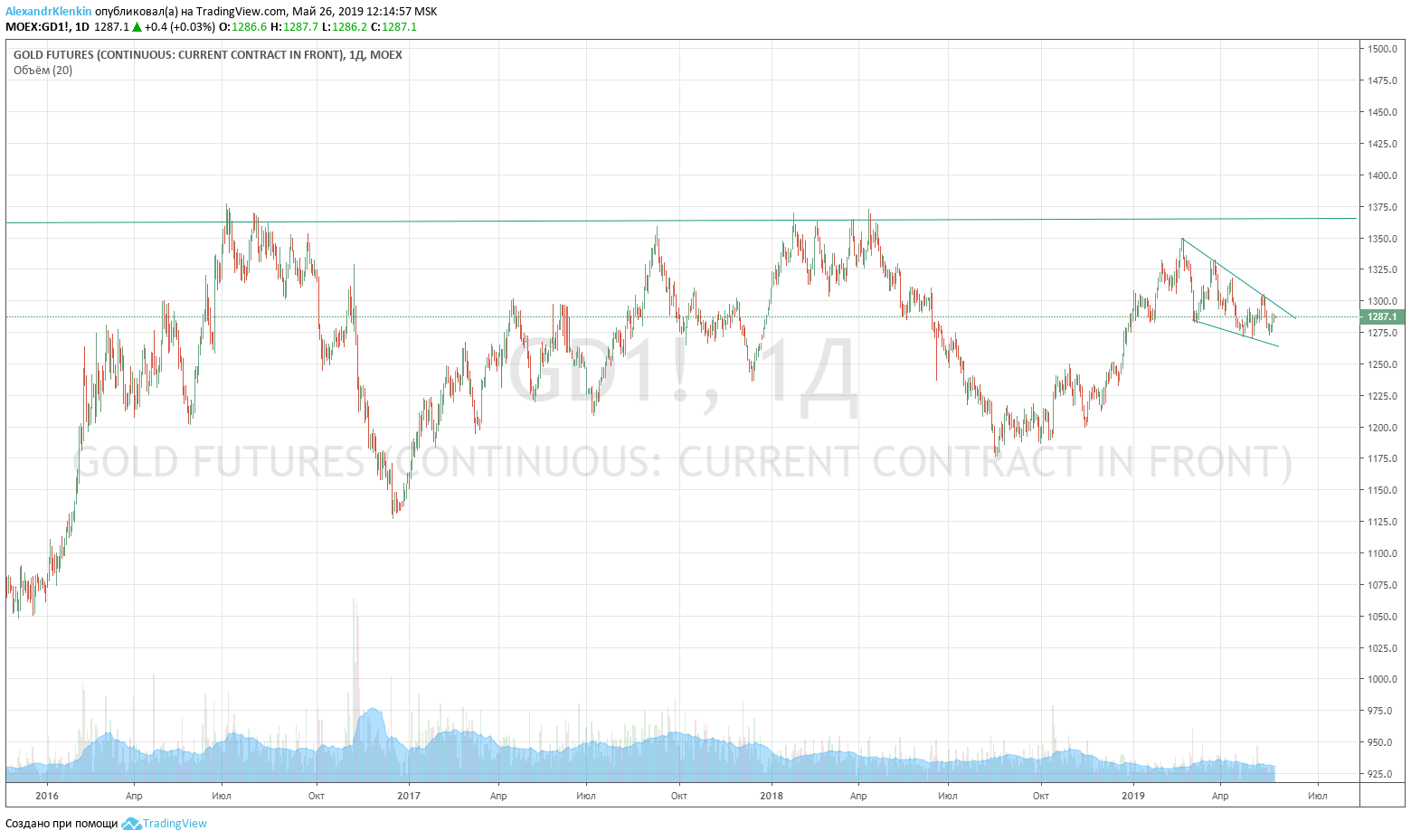 На дневках отчетливо видно формирование фигуры флаг, ожидаю выход вверх, с целями 1365, 1520. Цена несколько лет консолидируется под уровнем 1365, что является бычьим сигналом. Поэтому буду торговать от лонга. Пока золото у меня не в приоритете, не могу никак в него войти нормально, наверное дождусь уже выхода из фигуры:
