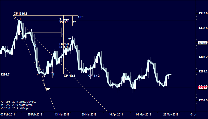 На дневном плане цена "уперлась" в уровень НР модели расширения 1271 и готовится покорять высоты севера, обратите внимание на уровень т.4 1286 (об этих уровнях подробней в материалах "Школы искусств" на нашем сайте) :